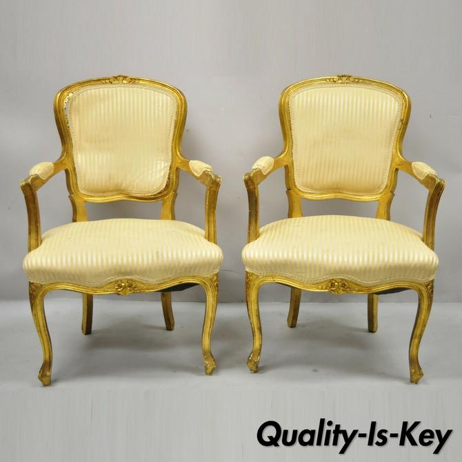 Gold Gilt Chairs / 21 1/2 x 19 x 33, 16 1/2 seat height condition:. Made entirely by hand by the top carvers and craftsmen from indonesia, this bedroom range of furniture is finished in genuine gold gilt leaf, hand applied onto a coating of gesso gilt and firmly glued and brushed into the contours of the carvings. Set of 6 white & gilt porcelain bowls & coordinating fondue / chafing pot & lid. A pair of french style cane chairs with gold gilt floral detail. French louis xv gilded living room, parlor set. Marked as fair condition due to minor cane separation on one seat from chair.